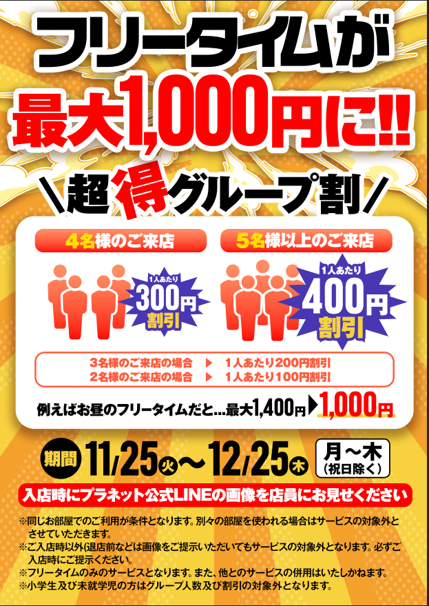 【最大400円OFF!!グループ割開始】 2025.11.25 人数に応じてお安くなります! ご入店の際はこちらの画面か【プラネットLINEの画像】をご提示お願いいたします。 https://lin.ee/7LbfPs3 Tweet Share +1 Hatena Pocket RSS feedly Pin it 【電話予約承ります】 前の記事